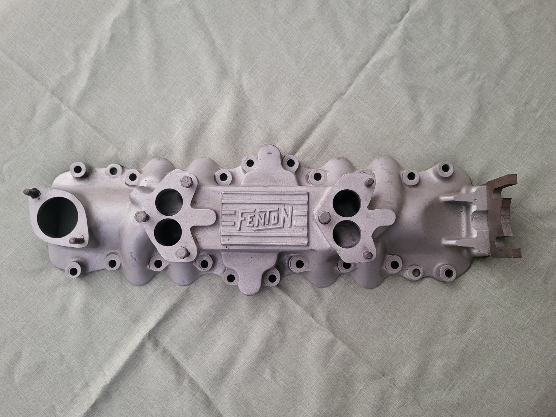 Great original Fenton dual 2bbl intake. Clean and all bolt holes are solid. It has a modified generator mount. Very well made and appears to be an old build. Please look at the pictures carefully.